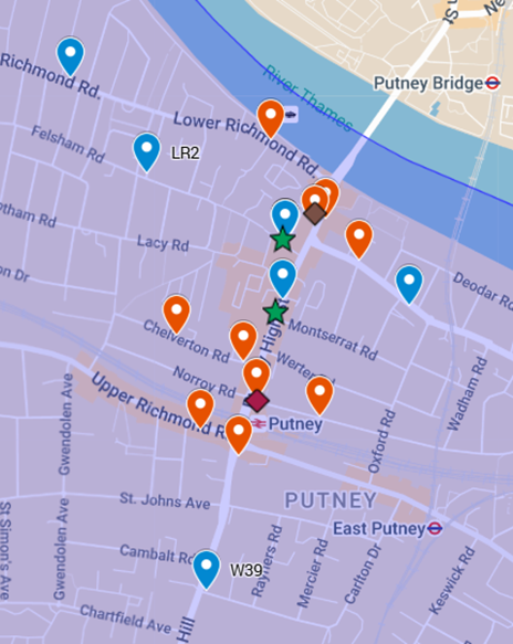 - Trial relocation of bus stop P outside Kenilworth Court on Lower Richmond Road. Bus stop P has now been suspended and a temporary stop located 40m westwards to improve westbound flow and reduce congestion back into the High Street, in late October 2025