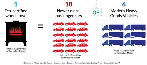The hourly PM2.5 emissions (in grams per hour (g/h)) from 1 eco-certified wood burning stove (3.1 g/h) is equal to 18 newer diesel passenger cars (each rated at 0.17 g/h) or 6 modern heavy goods vehicles (each rated at 0.5 g/h).