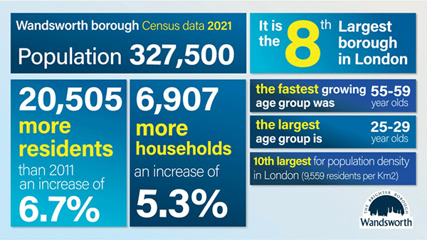 The London Borough of Wandsworth is the eighth largest borough in London at 327,506 (2021 census). It is a vibrant borough, with two distinct groups of populaces, one being the transient young, who are affluent and in good health. The other group is distinctly those who have lived in the borough for a longer period of time, often those who are very young and those that are elderly (JSNA).