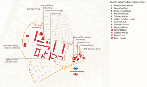 The map below shows the existing buildings on site and the residential blocks proposed for replacement: