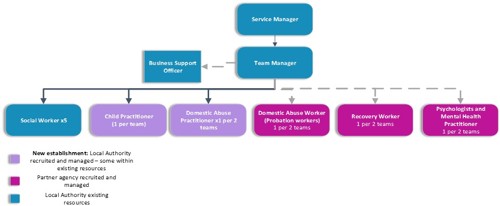 Under the Family Safeguarding model, Children's Social Workers along with Adult Mental Health, Substance Misuse and Domestic Abuse Practitioners will work together as one team. Multi agency practitioners will be co-located in Social Work teams rather than referring parents elsewhere, making it as easy for them to access help.