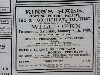Opening on the 30 January 1909, King's Hall is thought to be the first purpose built cinema in Britain. It is known that the second cinema to open in Tooting was the Central Hall Picture Palace on 14 October 1910.