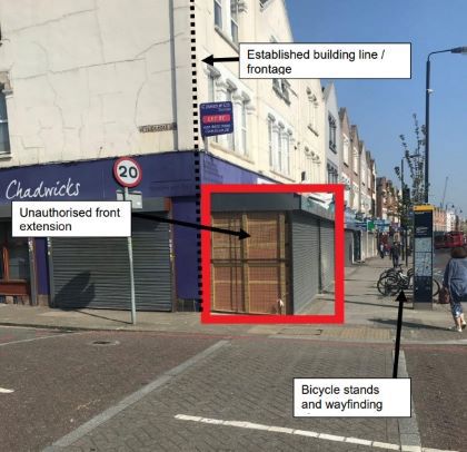 The council used enforcement powers under the Town and Country Act to remove the illegal extensions which had been crudely constructed out of sub-standard materials, encroached into pedestrian space, disrupted the building line of neighbouring shops and businesses and were visually damaging to the streetscene.