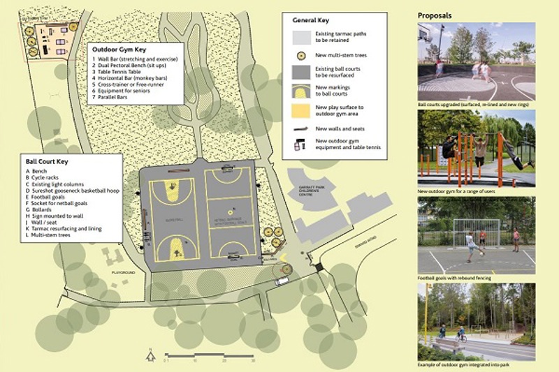 Local people are invited to comment on the refurbishment of the ball court and outdoor gym in Garratt Park, Tooting.