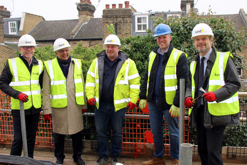 Last week (Thursday 3 March), the Leader of Wandsworth Council, Cllr Ravi Govindia, and Wandsworth’s Cabinet Member for Housing, Cllr Jonathan Cook, joined senior figures from Kind & Co to attend a topping out ceremony for the Gideon Road development. This is a significant milestone for the project and marks the end of the external works.