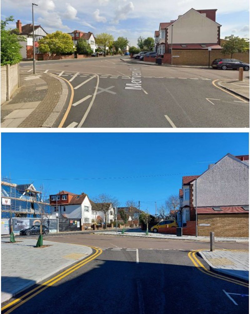 Kerb buildouts have been introduced to slow motorists, while the pavement has also been widened with four trees planted to improve its appearance, along with double yellow lines to prevent parking close to the junction and to increase visibility.