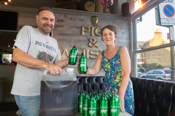 Cllr Gasser at the Pig and Whistle pub, which is running a cooking oil recycling scheme