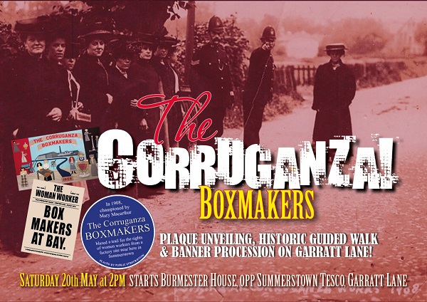 Meanwhile Summerstown 182 will be hosting a guided walk of the area near Wimbledon Stadium, followed d by a plaque unveiling on Burtop Road Estate acknowledging ‘The Corruganza Boxmakers’ whose strike in 1908 was a key moment in the struggle for women’s rights in the workplace. Book online at corruganza.eventbrite.co.uk