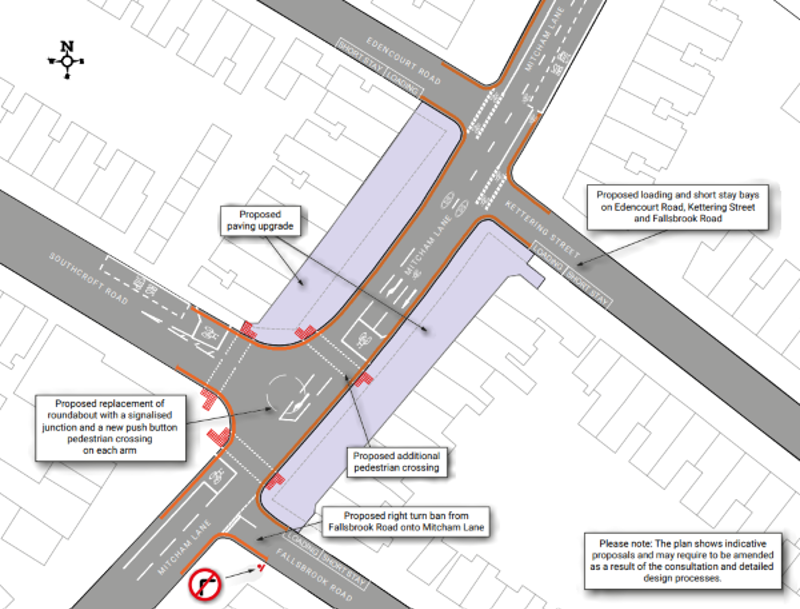 It would mean some modest changes to parking bays at the junction – with new replacement short-term parking and loading bays provided on Edencourt Road, Kettering Street and Fallsbrook Road to cater to the needs of passing shoppers and businesses.