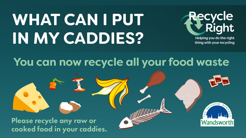 Eligible households can now recycle all food waste, using their outdoor brown caddy and indoor silver caddy. This includes all,