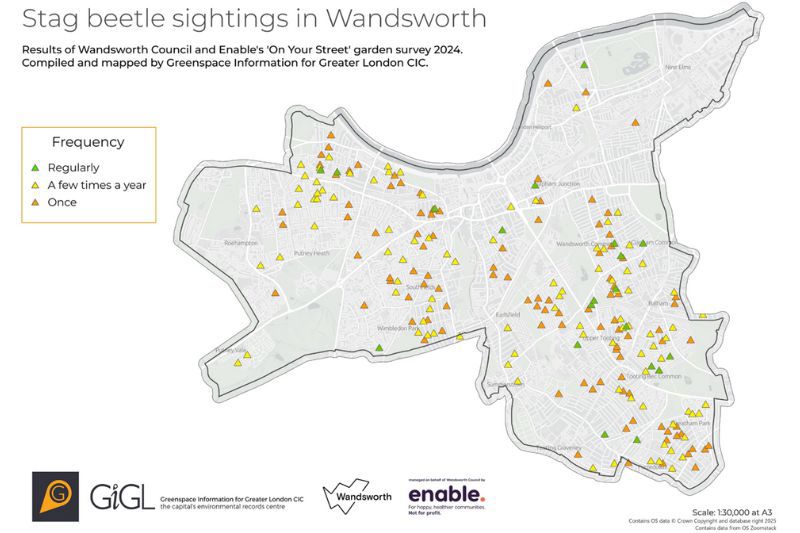 The results show that hedgehog sightings were most common in Putney, with residents highlighting features like native hedges and log piles. Meanwhile, stag beetles (a nationally important species) were spotted more widely across the borough, though less than half of people reported having the dead wood habitats that they depend on.