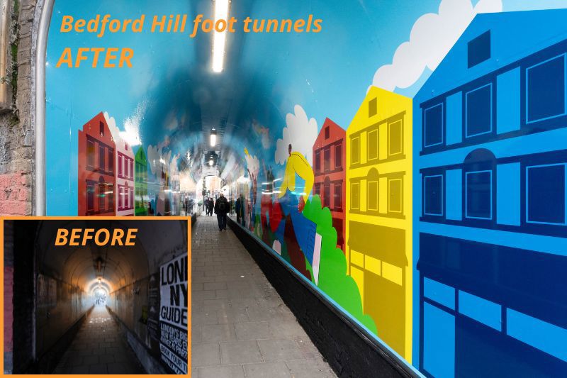 In Balham, the once dark Bedford Hill pedestrian tunnels have been transformed with bright and bold new artwork, lighting repairs and railing planters, turning this route into a more attractive route and landmark for pedestrians.
