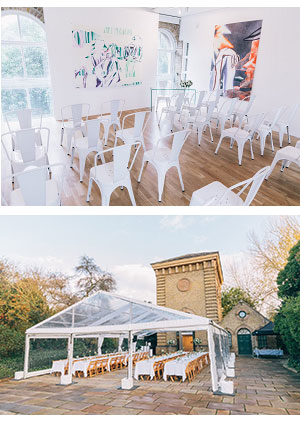 The gallery is licensed for weddings with a blank canvas throughout, allowing you to make the space your own. You are welcome to hire just the inside gallery space for your ceremony should guest numbers be under 78 people; if you are looking for a small, intimate ceremony space this is the one for you. A marquee is always required on the terrace should you decide to stay for your reception, being used for your meal and evening celebrations. In the case of bad weather and your numbers being over 78 people, we set the marquee up as a ceremony space with the marriage taking place in our large double doors; the space is then turned over ready for the reception part of your day. The floors in the gallery are used in a variety of ways such as bar, cloakroom, photobooth or children's area and being the only Grade II listed building in the Park, it makes for a very memorable event.