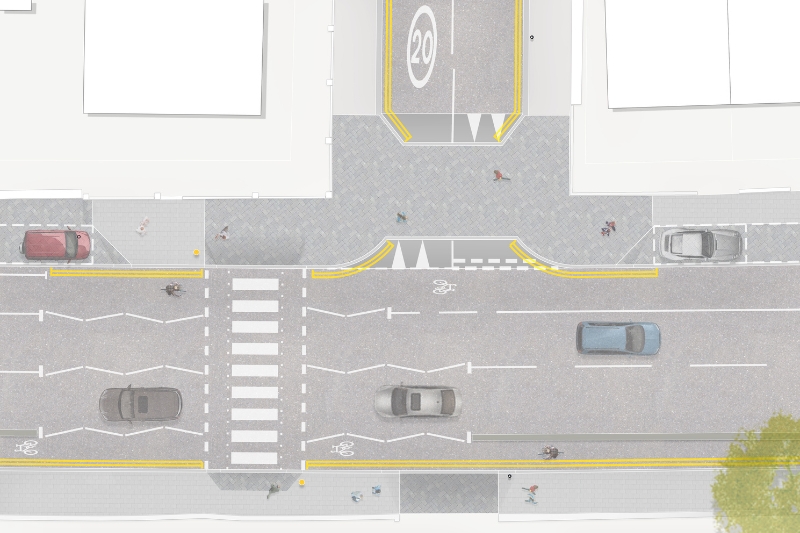 - ‘Copenhagen crossings’, also known as continuous footways, at the side roads for easier pedestrian access. This is where the pedestrian track extends across the junction of a side road, showing the pedestrians right of way more clearly